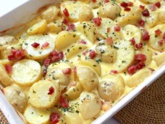 SASTOJCI: 1 kg krumpira 1 mali luk 150 grama kockica slanine/bacon 300 ml slatkog vrhnja 80 grama tvrdog ribanog sira ( parmezan ) 1 jaje/ […]