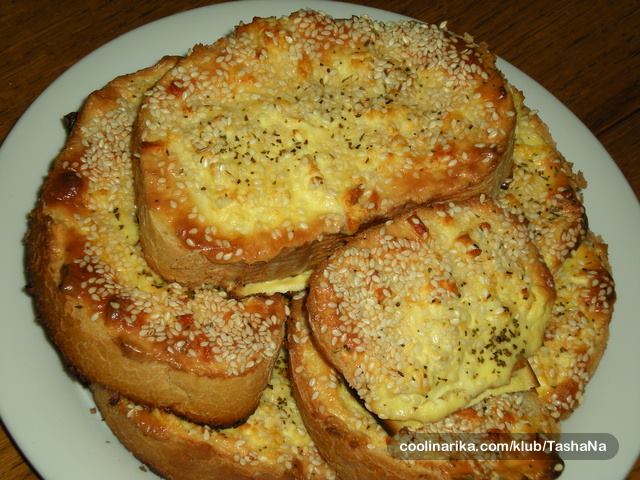 Umakati parčiće hleba, pa ih okrenuti da se natopi i druga strana. Hleb slagati u pleh obložen papirom za pečenje. Pospite odozgo origano. Dok ovo radite uključite rernu da se zagreje na 200 C stepeni. Ubacite pleh u rernu i hleb pecite dok ne porumeni. Kod mene je to gotovo za nekih 10 minuta, jer koristim topli vazduh.
