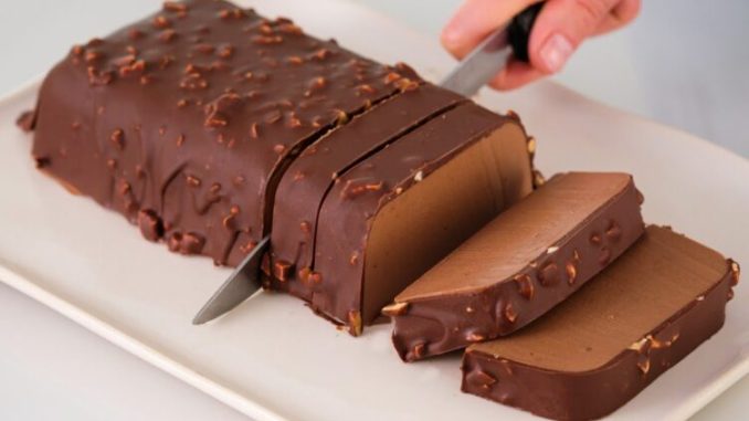 U mleko dodajte želatin i stavite da se zagreje, pa dodajte čokoladu. Mešajte dok se ne istopi, pa kada proključa ostavite još 3 minuta. Sipajte u vatrostalnu posudu dimenzija 26x12x10 cm (ili približnih dimenzija). Dobijenu smesu sipajte u posudu, pa stavite u frižider na 2 sata ili u zamrzivač na sat vremena. Istopite čokoladu sa lešnicima sa uljem i prelijte preko kolača i ostavite 15 minuta u frižideru da se stegne.